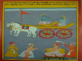 | Description / विवरण | Miniature painting based on Shri Bhagwat Gita. It depicts Krishna preaching Arjun that Tej, ushma, patience, holiness loyalty without proud, one who carries all these qualities becomes wealthy. |