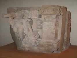 | Description / विवरण | It is an architectural stone piece on which image of Parvati with four hands has been carved out. Out of four hands, three are broken, she is holding different type of object in her hands. Besides Parvati, three other images of Ganesh, one attendant and one devotee can be seen on this architectural piece.Floral designed ornamentation is also executed on it. |