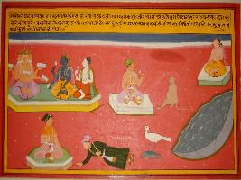 | Description / विवरण | Miniature painting based on Sanskrit drama - Prabodh Chandrodaya depicting a king in the centre. The Sutradhara tells about Brahma, Shiv and Vishnu. In the left side a priest, a monkey and a bird are seen. |
