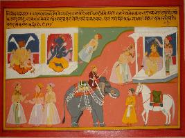 | Description / विवरण | Miniature painting based on Sanskrit drama Prabodh Chandrodaya depicting King Gopaldev who asked two people to write about the Narasimha and Boar incarnation. |