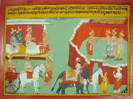 | Description / विवरण | Miniature painting based on Mahabharat - Udyam parva depicting Arjun telling to Rukmak in the war that either Yaduor he will be alive. |