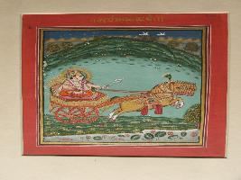 | Description / विवरण | It is a painting, in which Aryama, the Surya is shown sitted on a chariot riding horse. He is shown with a flower and in background moutain is painted. |