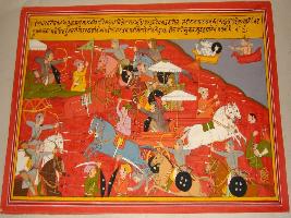 | Description / विवरण | Miniature painting based on Mahabharat - Drona parva. dron is making chakravyuha to capture ydhisthira. Yudhisthir is moving out of battle and Dristadumna come from back to fight with Drona. Drona is depicted killing the Pandav army like Indra killing demons. |