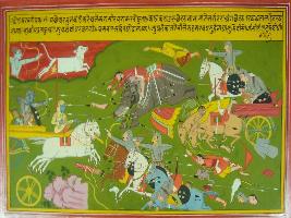 | Description / विवरण | Miniature painting based on Mahabharat - Drona parva depicting Arjun fighting furiously with Kaurava army and crunching them very ruthlessly. Elephant horses are killed them. |