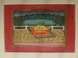 | Description / विवरण | It is a painting in which parrot faced human figure is shown sitted on a mat, in a fortified terrace; while at the background mountain is painted. |