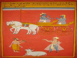 | Description / विवरण | Miniature painting based on Shri Bhagwat Gita. It depicts Krishna preaching Arjun about non violence, truth calmness, sacrifice, kindness and softness on other living beings etc. |