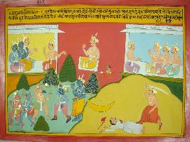 | Description / विवरण | Miniature painting based on Mahabharat - Udyam parva depicting Krishna preaching Arjun that if he is scared of Kauravas then he should go and tell Bhishma and others that he accepts Duryodhan as a king. |