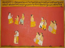 | Description / विवरण | Miniature painting based on Sanskrit drama - Prabodh Chandrodaya depicting Mahadev in the upper right corner with Manu. A man and woman are standing in a loving union in the right part. In the other side some seated men are seen. |