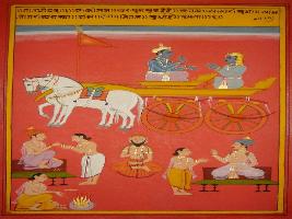 | Description / विवरण | Miniature painting based on Shri Bhagwat Gita. It depicts Krishna preaching Arjun about Abhaya, Knowledge, constitution yoga, daan power and yagna. |