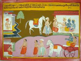 | Description / विवरण | Miniature painting based on Mahabharat - Udyam parva depicting after being defeated in war Rukmak set up a new city named Bhojkat. Then Rukmi came near Yudhisthir and Yudhisthir received him with respect. |