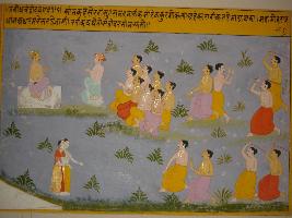 | Description / विवरण | Miniature painting based on Sanskrit drama - Prabodh Chandrodaya depicting Kama telling Rati about Ahankar. Sirateshu is sitting with some men in sitting posture. While the Ahankar is depicted by two people torturing another two people. |