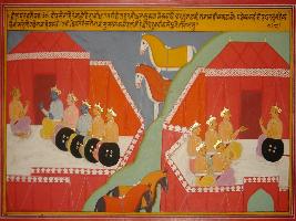 | Description / विवरण | Miniature painting based on Mahabharat - Drona parva. The painting depicts that Pandavas are planing about the battle with Yudhisthir while Duryodhana is talking with Susarma in their camp. |