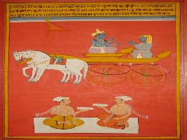 | Description / विवरण | Miniature painting based on Shri Bhagwat Gita. On the painting Krishna is saying something Arjun where the 16 Adhyaya also come into end and this painting is belongs to king Jai Singh. While two priests also depicted in the lower part of the painting. |