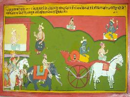 | Description / विवरण | Miniature painting based on Mahabharat - Udyam parva. Krishna is depicted going on chariot and many people mounted on horse and elephants depicted following him. |
