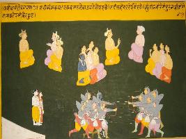 | Description / विवरण | Miniature painting based on Sanskrit drama - Prabodh Chandrodaya where Kama says that only due to the ahankar and Kama, the sons of Pandu and blind king Dhritrashtra s sons, Kauravas, fought in the great battle of Kurukshetra. |