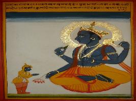 | Description / विवरण | Miniature painting based on Shri Bhagwat Gita. Vishwaroop from of Krishna where Arjun also seen in Namaskara mudra. than Arjun says about Shankh, Chakra, Gada, Padma of Vishnu. |