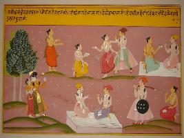 | Description / विवरण | Miniature painting based on Sanskrit drama - Prabodh Chandrodaya depicting a couple in loving posture holding flowers in hands, Pundits in sitting, standing and talking to a noble man, two men sitting and talking and a standing warrior. |