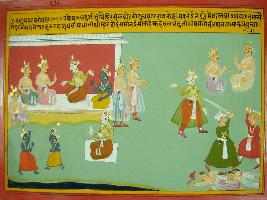 | Description / विवरण | Miniature painting based on Mahabharat - Udyam parva. It is depicts Balram telling Yudhisthir that this war is not right and it would lead to disaster. He told him that both Pandavas and Kaurava are similar to him. He has tought both Arjun and Duryodhan to fight with mace. After saying this, he asked for their blessing and movest for pilgrimage. |