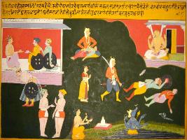 | Description / विवरण | Miniature painting based on Sanskrit drama - Prabodh Chandrodaya depicting natas describing about Gopal deva in front of whom all his subjects and armies bow down their heads, who can kill any strong and powerful enemy. At the upper left side the Narasimha avatar of Vishnu is depicted and at the lower left Varaha incarnation of Vishnu is depicted. |