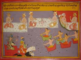 | Description / विवरण | Miniature painting based on Mahabharat - Drona parva. Dritarasta is depicted with Sanjay there is also depiction of two persons playing chaupan and on the lower part Arjun is depicted fighting with Dev Sena. |