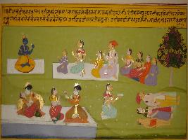 | Description / विवरण | Miniature painting based on Sanskrit drama - Prabodh Chandrodaya depicting Krishna seated on a mat and a man, woman and children sitting in front of him. In the lower part, a couple in loving posture and also talking, a seated woman, and a man, a woman and a child lying on earth are depicted. |