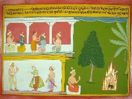 | Description / विवरण | Miniature painting based on Mahabharat - Udyam parva depicting Krishna telling Pandavas to make Dristadhyuma as commander-in-chif as he born from fire of yagna for the purpose of killing Dronacharya. After that Arjun put tilak on all warrior and Krishna put on Arjun. |