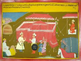 | Description / विवरण | Miniature painting based on Mahabharat - Udyam parva depicting Duryodhan, Sakuni, Karna and Dushashana move to Kurshetra and put their camps near battle field. |
