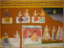 | Description / विवरण | Miniature painting based on Sanskrit drama - Prabodh Chandrodaya depicting Mati of a king talking to the Vivek, if someone comes in contact with women, he leaves his patience and moves towards destruction. In the lower central part, mating of a couple is depicted. |
