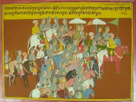 | Description / विवरण | Miniature painting based on Mahabharat - Drona parva depicting Dronacharya had made Gadruda vyuha to captivate Yudhisthir and and evoked Kritvarma and Kripacharya to hold Anjun somewhere. |
