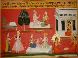 | Description / विवरण | Miniature painting based on Sanskrit drama - Prabodh Chandrodaya depicting knowledge talking to a king at the lower right corner of the painting, on their left a family is depicted, above them another family is sitting. In the left part, inner consciousness is depicted. |