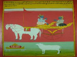 | Description / विवरण | Miniature painting based on Shri Bhagwat Gita. It depicts Krishna preaching Arjun that one should leave the worldly desires and come into his shelter and he will free him from all sin. |