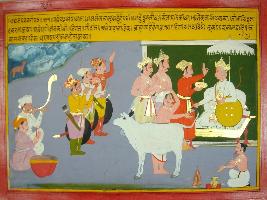 | Description / विवरण | Miniature painting based on Mahabharat - Udyam parva depicting Vaishpayan is telling Janmejeya about Duryodhan selecting and appointing Bhishma as commander-in-chief of Kaurava army and gives many danas. But at this time, sign of bad omen-earthquake, famine and floods occur in state. |