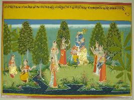 | Description / विवरण | Miniature painting based on Geet Govind depicting Radha and a gopi where the gopi says about the Raas Lila that going on at Vrindavan in the bunch of the river Yamuna. |