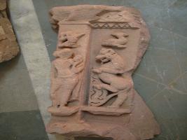 | Description / विवरण | It is a architectural part carved with a Lady Figure and a Vyala. The Alasha Kanya is in tribhanga posture with a Vidhayadhar on the top. A figure of goose is carved above Vyala figure. |