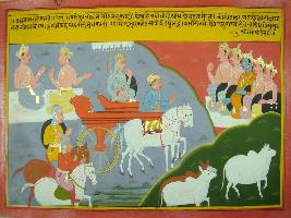 | Description / विवरण | Miniature painting based on Mahabharat - Udyam parva depicting Duryodhan asking Bhishma to lead the war and he will follow him as big bulls walks in front of the small animals. Then Bhishma says that if Duryodhan will fight with Pandavas then nobody will left to fight with him. |