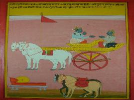 | Description / विवरण | Miniature painting based on Shri Bhagwat Gita. It depicts Krishna preaching Arjun this secrets gyan he had given him and now he would have to decide. |