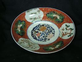 | Description / विवरण | Saucer, small, glazed with a natural landscape with mountains and sky is background and trees. |