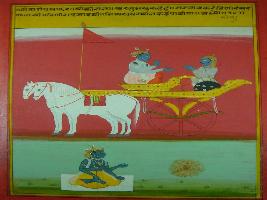 | Description / विवरण | Miniature painting based on Shri Bhagwat Gita. It depicts Krishna preaching Arjun that you should go to that person who loves you. If you are able to find it than you get respect and incomparable love. |