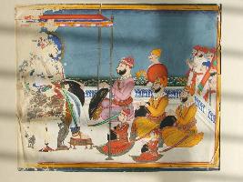 | Description / विवरण | King is sitting on throne. Six male attendant is shown in sitting from in front of King. Five men had also shown in standing form of king. Katar is shown with five male attendant. |