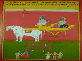 | Description / विवरण | Miniature painting based on Shri Bhagwat Gita. It depicts Krishna preaching Arjun all creatures if believes in Him they would get blessing from Him. |