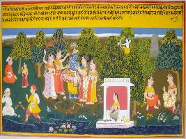 | Description / विवरण | Miniature painting based on Geet Govind depicting Krishna s Raas Lila with gopis, Kamdev shown on the tree. Gopis are easily made sentimental by Krishna. |