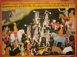 | Description / विवरण | Miniature painting based on Mahabharat - Drona parva. The painting depicts that Abhimanyua came down from chariot and started gadAyudh while on the painting Bhim is seen doing Gadayundha. This fight is comparing on the fight of elephant and tiger and the painting depicts the above mantioned story. |