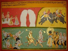 | Description / विवरण | Miniature painting based on Mahabharat - Gada parva depicting two great heros-viz. Bhim and Duryodhan fighting with each other. Bhim said Duryodhan that he killed the sons of Duryodhan that the killed tha sons of Draupadi, so he will kill him other Pandavas and Krishna are watching the fight. |