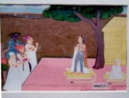 | Description / विवरण | The painting depicts a lady standing on tigers hide and an old lady besides her in front of a hut wrapped in white clothes. In front of them there are five people, three of them are soldiers talking to the lady. In background there are field palace and sky. |