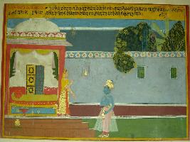 | Description / विवरण | Miniature painting based on Rasikpriya depicting Dugalbhawajnam. Radha is standing near a bed and Krishna arriving to meet her and standing near the steps. |