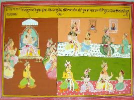 | Description / विवरण | Miniature painting based on Harivansha depicting genealogical decendancy of king Puru. He was having seven sons, among whom Amavas was eldest. His son was king Bhim. king Bhim s son was Kanchan and his son was king Sahotra. The son of king Sahotra was king Suta. |