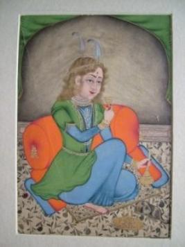 | Description / विवरण | An European woman with golden hair jewelry with a bird s feather wearing blue gown with green over coat, is sitting by red cushion with golden bands and orange bolsters and drinking wine. She has cup in one hand bottle in another. A black cat is depicted in front of her. Black and white carpet with floral designs can be seen. |
