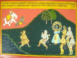 | Description / विवरण | Miniature painting based on Mahabharat - Gada parva depicting Duryodhan is moving forward for Gada -yudh with Bhim after wearing his body armour. Krishna and other Pandavas watching them. Bhim says he will kill Duryodhan in the way Indra killed demon Batrasura. |