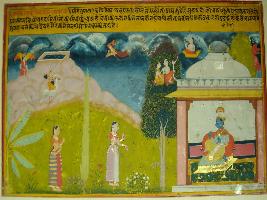 | Description / विवरण | Miniature painting based on Rasikpriya depicting all rasas. The painting depicts Krishna sitting on an asana, looking at Radha and appreciating and expressing her beauty. Radha is depicted standing in front of him with her friend. Apsaras and Devtas are depicted in the sky full of clouds and lightening. Rati and Kamdev are seen sitting on a tree. |