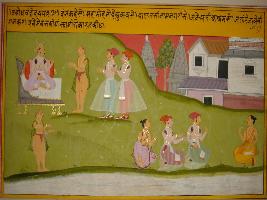 | Description / विवरण | Miniature painting based on Sanskrit drama - Prabodh Chandrodaya depicting Dambha talking to a king that he is coming from a hermitage from Varanasi, he tells the king to move there and get knowledge. |